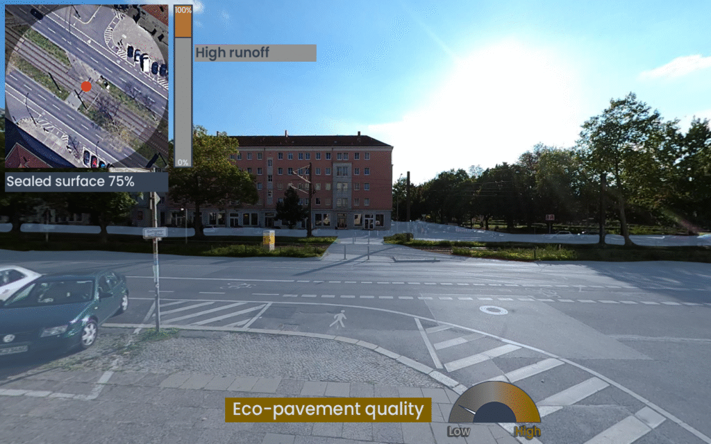Researchers analyze the existing urban and environmental conditions using ecosystem indicators on walkability, surface runoff, urban heat, and biotope loss.